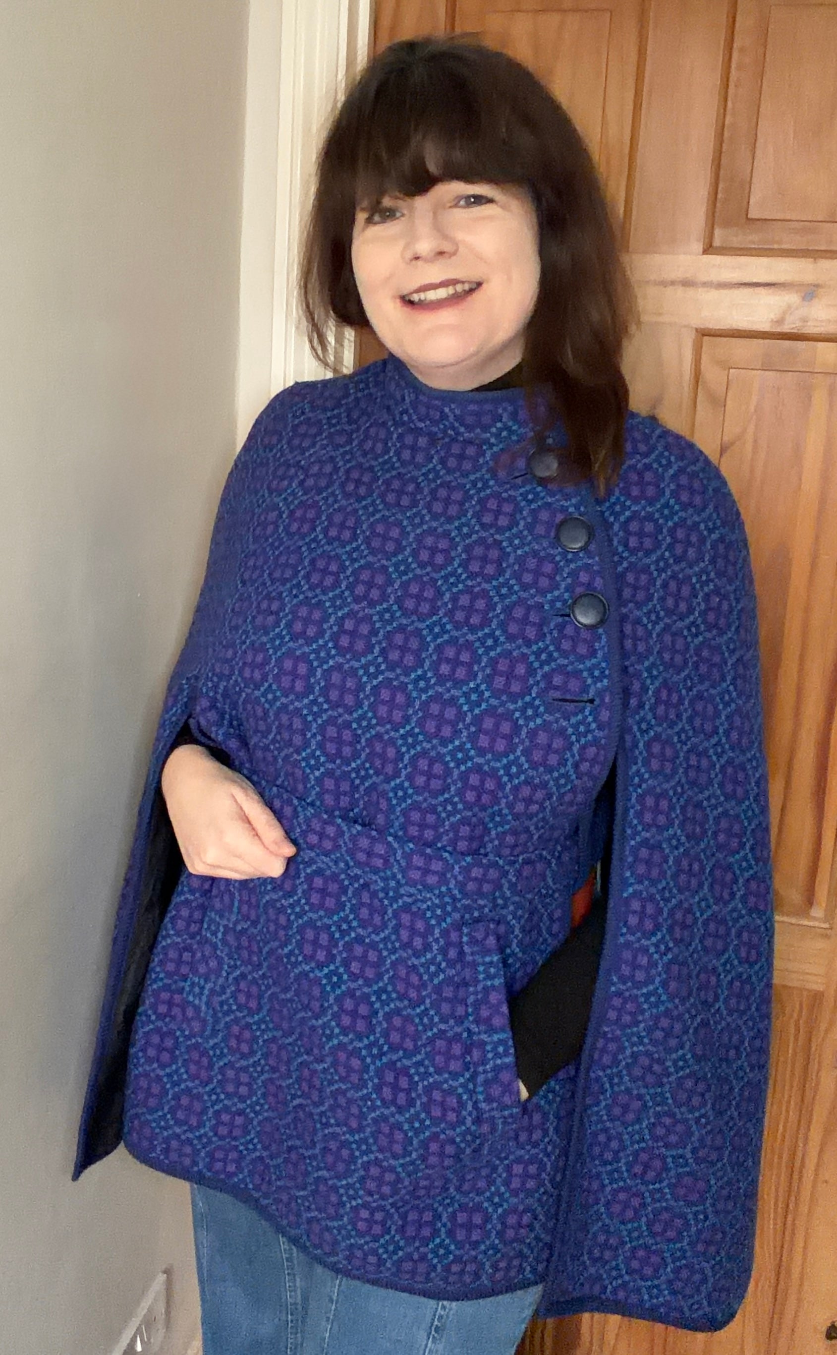 Welsh wool tapestry cape in royal blue & pink striking geometric pattern .